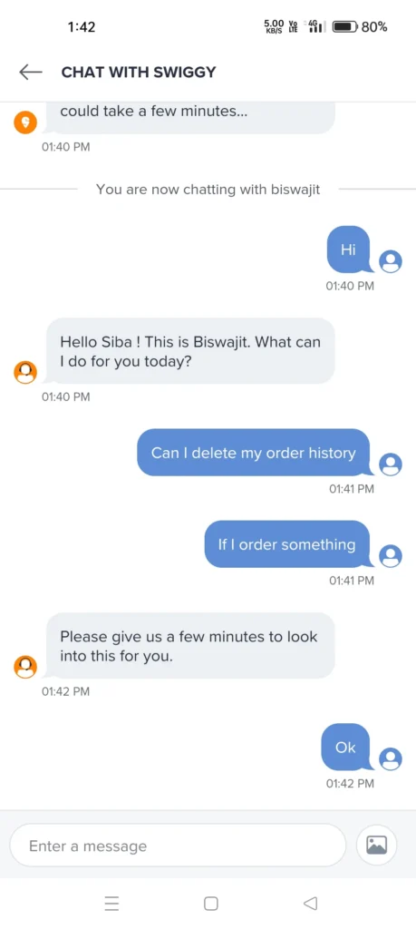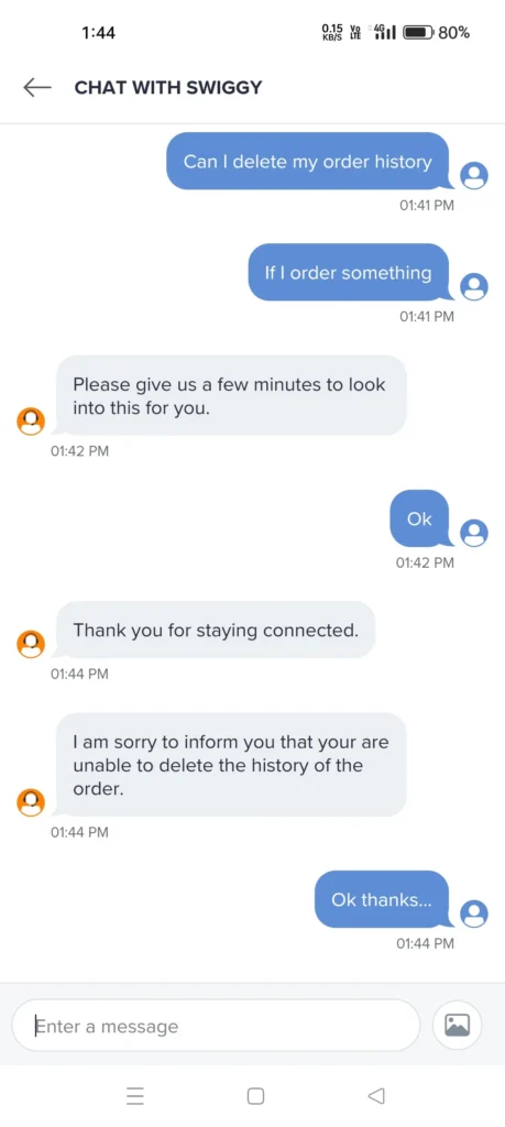 You can See the above Chat Image Swiggy Support team refuse to delete the order history, It means there is no way to Delete Swiggy Order History.